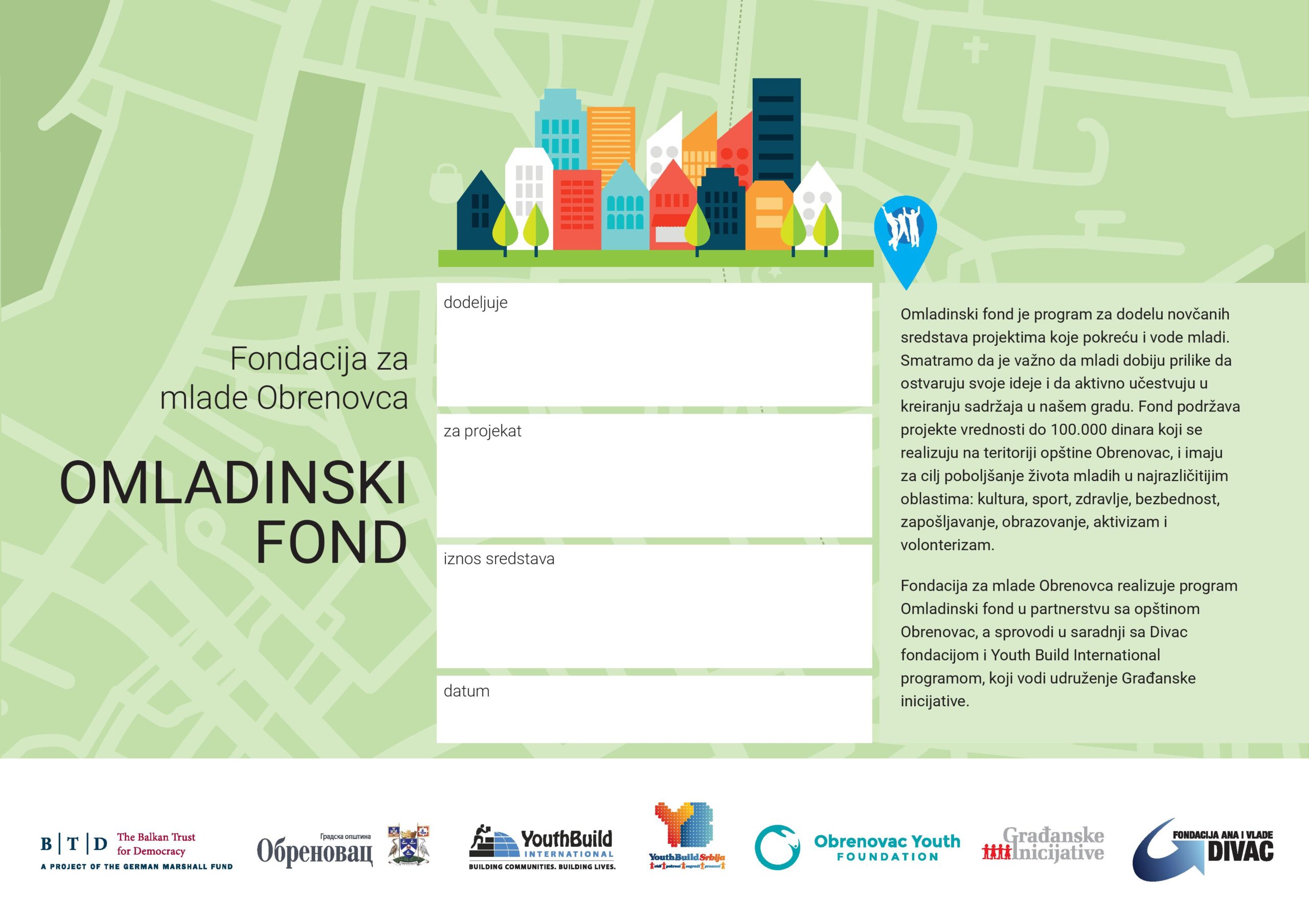 Program Omladinski fond realizuje Fondacija za mlade Obrenovca, u saradnji sa Fondacijom Ana i Vlade Divac i Gradskom opštinom Obrenovac, uz podršku Balkanskog fonda za demokratiju, Građanskih inicijativa i Youth Build Srbija programa.